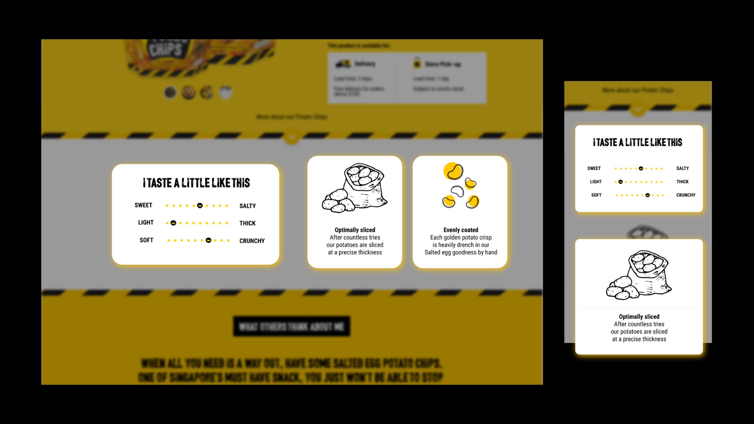 A sticky heard that showcased the range of the products was done to mirror physical store shelving where ease of visibility helps in creating interest for purchase. More importantly, a key aspect that required mirroring was sampling and tangible sensory interactions with products. This was replicated in the form of a sensory taste chart as well as an improved range of product images that helped users to gauge the taste, texture, smell and scale of products.